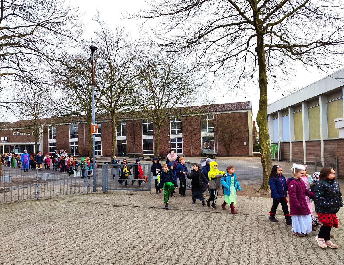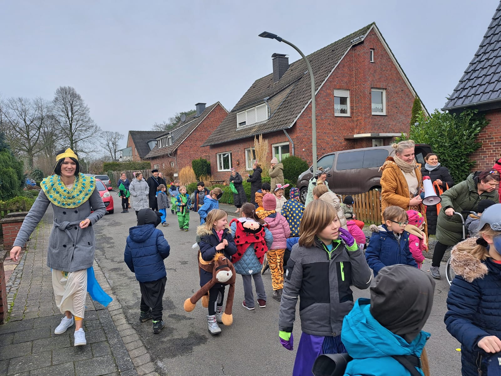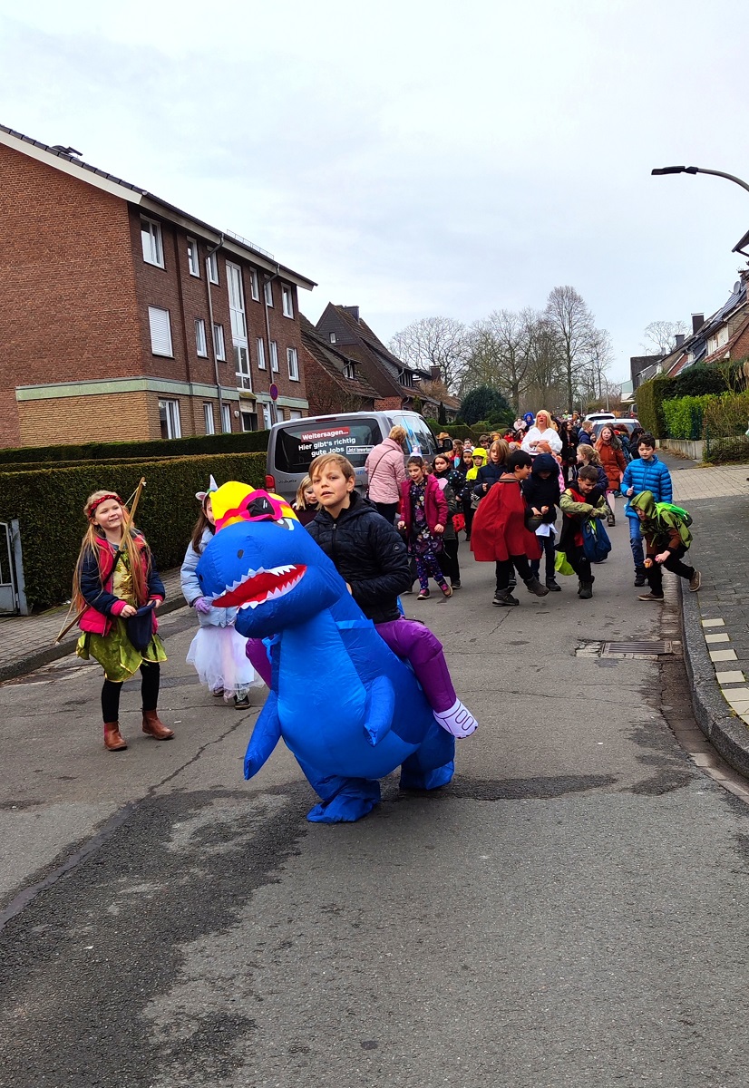 Zu fröhlicher Karnevalsmusik zogen die Kinder im Anschluss in einer Polonaise durch die Flure und starteten zu einem kleinen Karnevalsumzug durch das angrenzende Wohngebiet. Hier hatten sich wieder einige Eltern versammelt, um die Kinder zu feiern und Bonbons zu werfen.