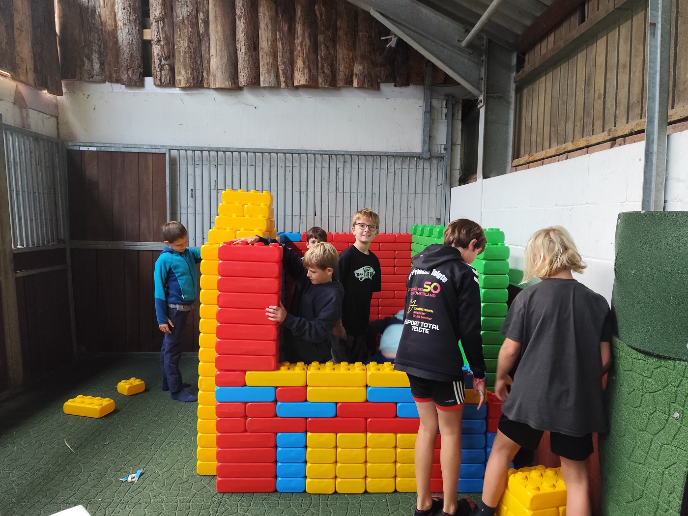 Nach dem Frühstück gehen wir in die Waschräume und machen uns für den Tag fertig. Dann gehen wir in den Indoor-Spielplatz und spielen Verstecken. Danach auf den Hüpftraktor und dann auf die Plastikpferde.