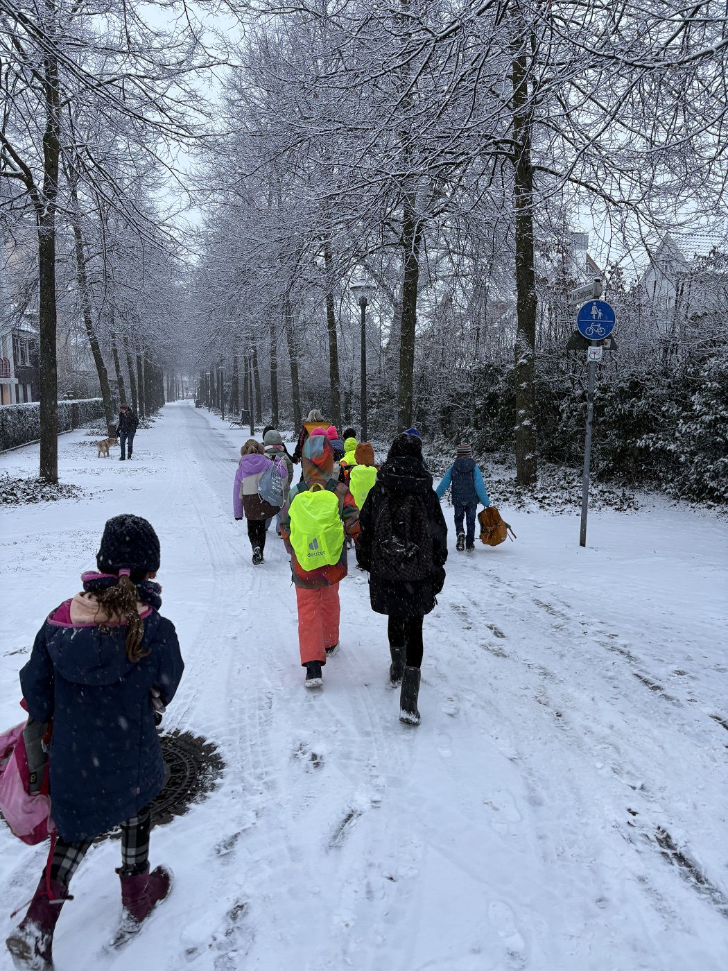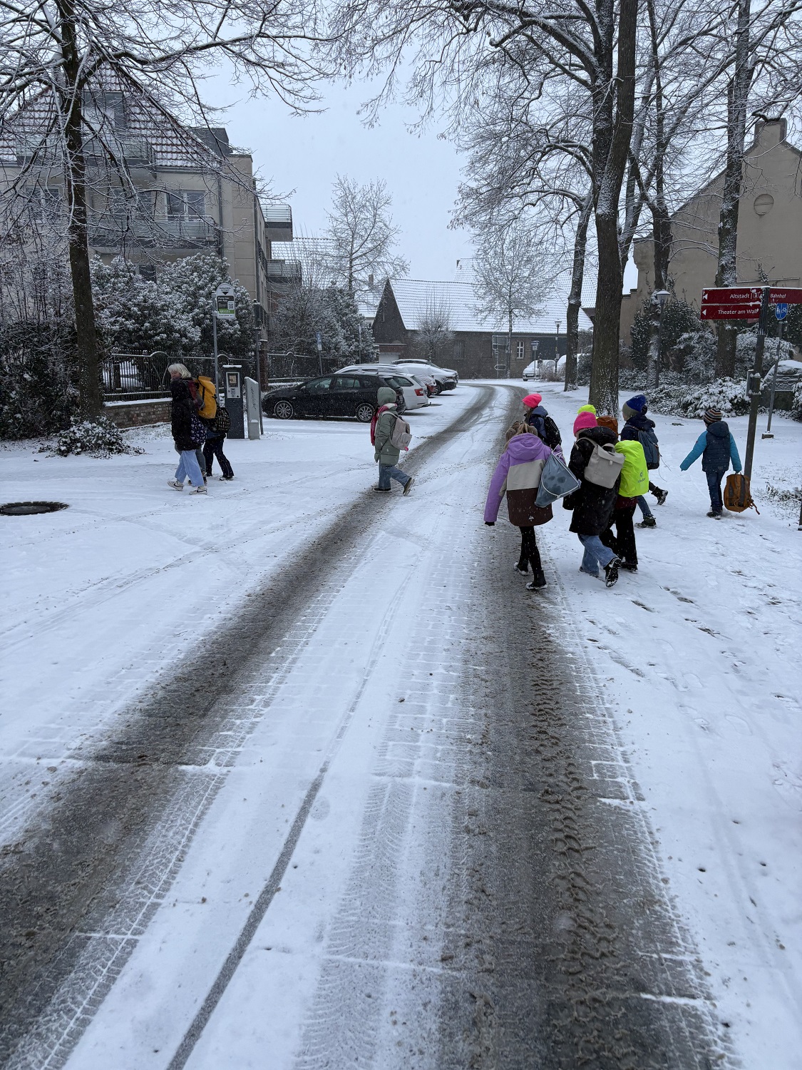 Am Montag sind die Klassen 2a und 2c mit dem öffentlichen Bus durch eine schöne Schneelandschaft nach Warendorf zum Bahnhof gefahren.