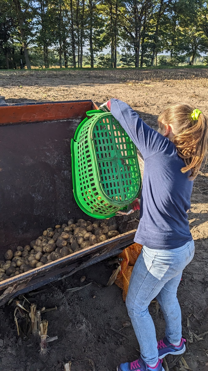 Nach einem schönen herbstlichen Spaziergang dorthin, blieb keine Hand sauber. Die Kinder buddelten ungezählte Kartoffeln aus der Erde und befüllten viele, viele Körbe. Zum Schluss war eine ganze Schaufel am Trecker befüllt.