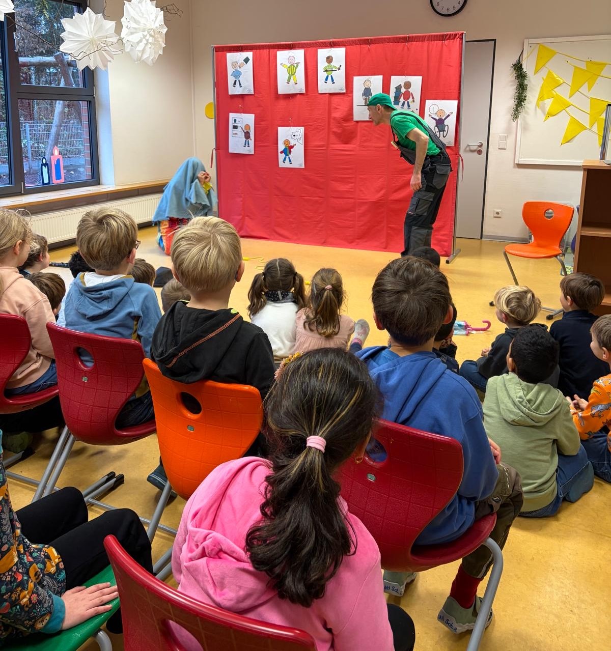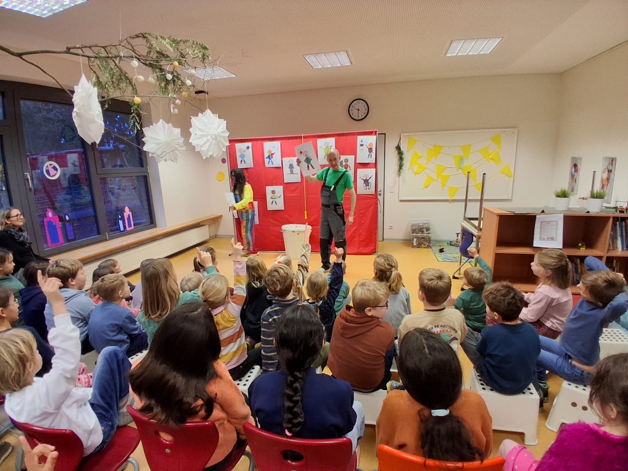 Zwei Akteure der Werkstatt haben, durch das Nachspielen von alltäglichen Situationen, den Kindern dabei geholfen, ihre Empfindungen bewusst wahrzunehmen und zu äußern.