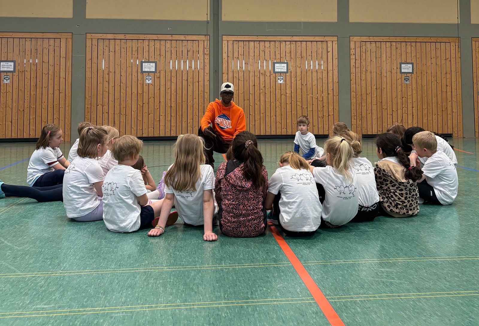 Als die Coaches sich dann vorgestellt haben, war ich überrascht, was sie alles konnten! Wir hatten Philipp. Der war sehr witzig und nett. Wir durften unsere eigenen T-shirts gestalten. Jedes Kind hat bei den anderen seinen Namen drauf geschrieben.