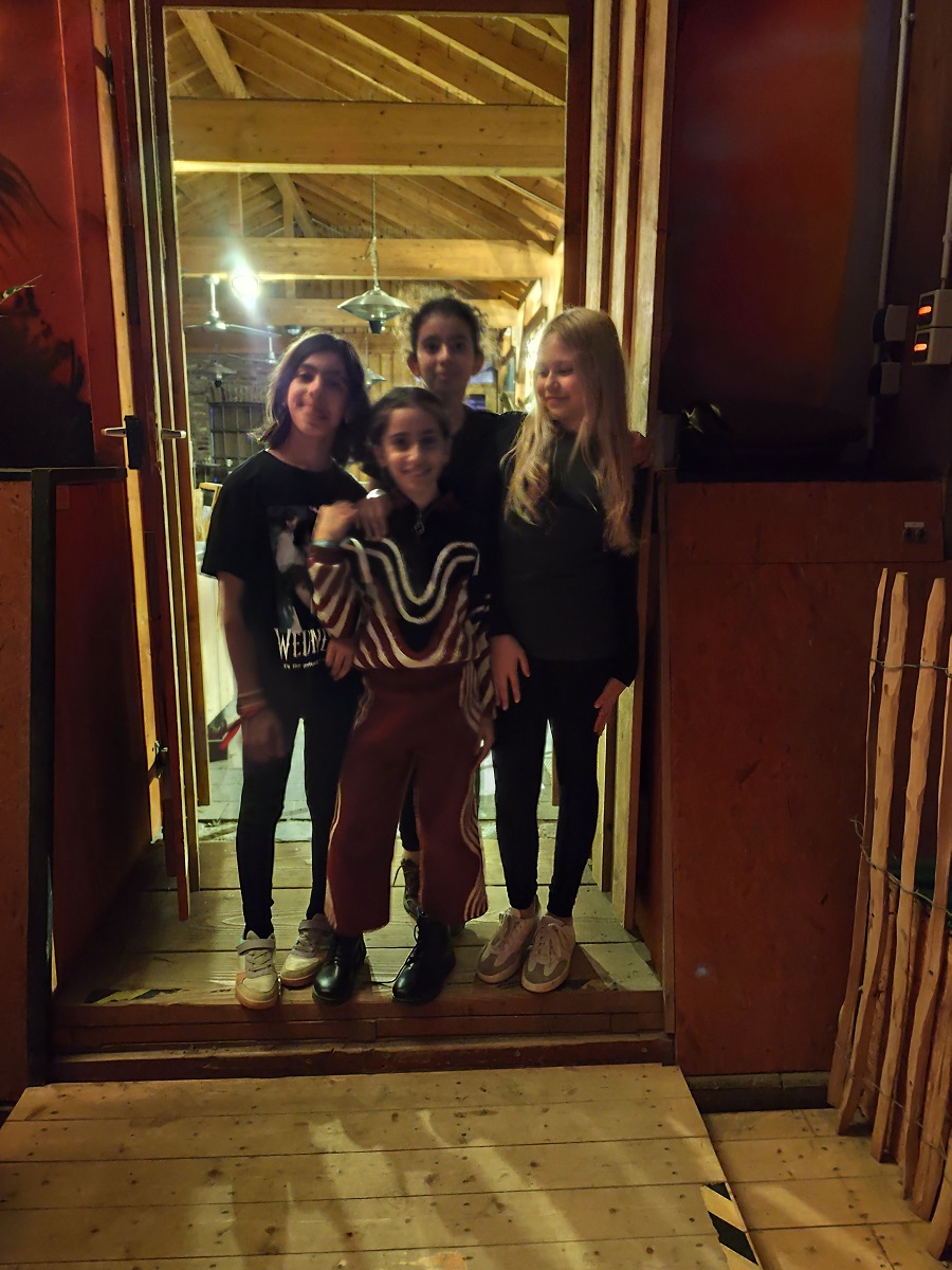 Als das Gepäck im Bus verstaut ist, fahren wir endlich los. Im Bus hören wir Musik, singen dazu und quatschen. Als wir ankommen, kriegen wir eine kleine Einweisung. Danach richten wir unsere Tippis ein, in denen wir schlafen. Carla und ich erkunden den Hof. Bei den Plastikpferden treffen wir Nora und Marie. Zusammen gehen wir zum Mittagessen. Es gibt Nudeln und Reis mit Pilz oder Tomatensauce und Salat. Als wir fertig gegessen haben, hüpfen wir ein bisschen auf den Hüpfkissen und dem Wasserdonut. Da ruft Frau Hohl uns zum Reiten.