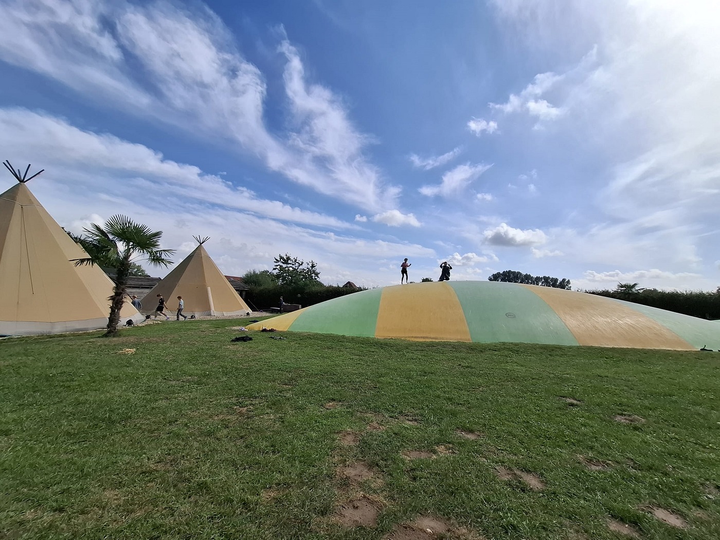 Wir sind immer in Zweiergruppen. Einer führt, der andere reitet. Nach dem Reiten gibt es Kuchen, Marshmallows und Wassermelone. Danach wollen wir eigentlich auf den Klettervulkan. Der ist nass und die Jungs machen eine Wasserschlacht auf ihm. Dann gibt es auch schon Abendessen und zwar Pizza. Die ist so schnell weg, deswegen müssen wir uns schon umziehen. Davor gehen wir noch duschen.
