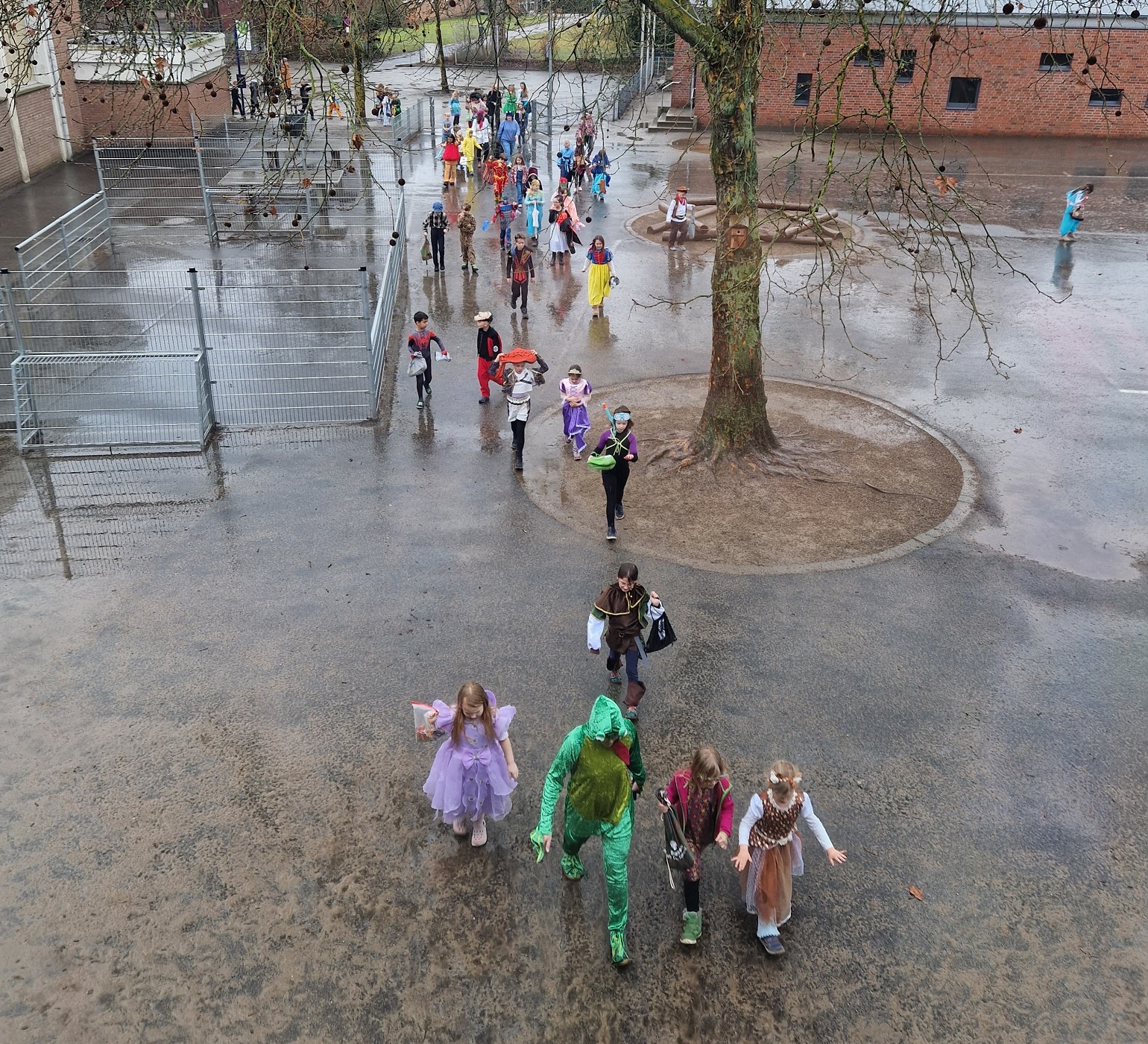 Nach der Regenpause haben wir mit den anderen Klassen eine Polonaise gemacht und haben Süßigkeiten von den Eltern gefangen.