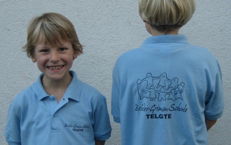Schulkleidung mit dem Schriftzug „Brüder-Grimm-Schule“ auf der Vorderseite und dem Logo unserer Schule auf der Rückseite gibt es als